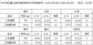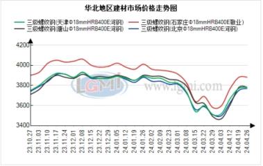云商平臺監測數據顯示,截至4月26日午間,天津市場Φ18mm三級抗震螺紋鋼價格為3780元,比上周同期價格漲10元;北京市場Φ18mm三級抗震螺紋鋼價格為3770元,比上周同期價格漲20元;唐山市場Φ18mm三級抗震螺紋鋼價格為3780元,比上周同期價跌10元;石家莊市場Φ18mm三級抗震螺紋鋼價格為3880元,與上周同期價格持平。