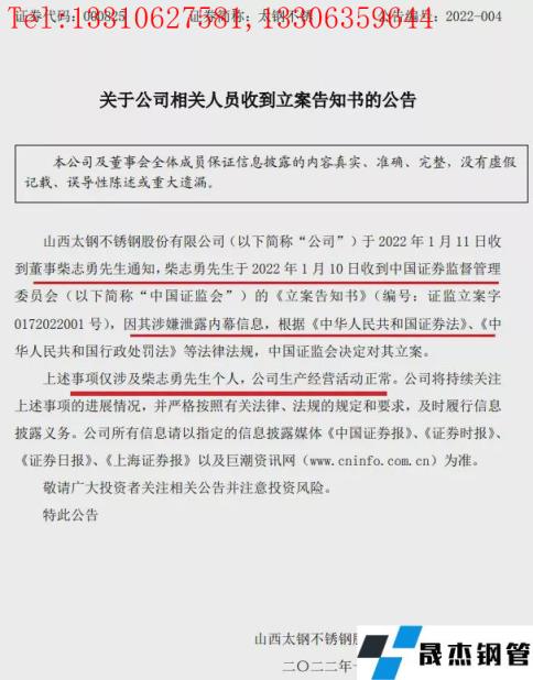 1月12日晚間,“不銹鋼龍頭”太鋼不銹發(fā)布公告稱,公司于2022年1月11日收到董事柴志勇先生通知,柴志勇先生于2022年1月10日收到中國(guó)證券監(jiān)督管理委員會(huì)的《立案告知書》(編號(hào):證監(jiān)立案字0172022001號(hào)),因其涉嫌泄露內(nèi)幕信息,根據(jù)相關(guān)法律法規(guī),中國(guó)證監(jiān)會(huì)決定對(duì)其立案。
