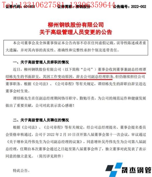 2月10日,柳州鋼鐵股份有限公司發(fā)布關(guān)于高級管理人員變更的公告。公告顯示,柳鋼股份董事會收到董事兼副總經(jīng)理譚紹棟的書面辭呈,其因工作變動原因,辭去柳鋼股份副總經(jīng)理職務(wù),但仍繼續(xù)擔任柳鋼股份董事職務(wù)。