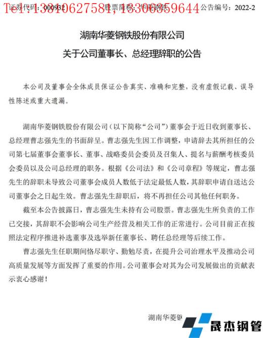 日前,湖南華菱鋼鐵股份有限公司發(fā)布公告稱,公司董事會于近日收到董事長、總經(jīng)理曹志強的書面辭呈。曹志強因工作調(diào)整,申請辭去其所擔任的公司第七屆董事會董事長、董事、戰(zhàn)略委員會委員及召集人、提名與薪酬考核委員會委員以及公司總經(jīng)理的職務(wù)。