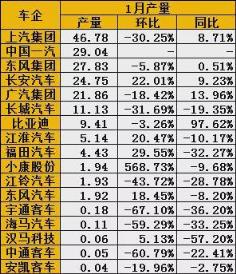 1月我國汽車產(chǎn)銷降幅明顯,多數(shù)車企呈現(xiàn)雙位數(shù)下跌