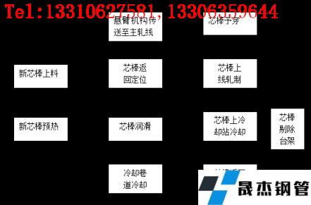 芯棒經返回輥道返回,途中經過三個冷卻巷道進一步冷卻,并經潤滑站(芯棒橫移小車前)潤滑,芯棒返回至芯棒預熱爐出口前擋板定位。完成芯棒循環全過程。
