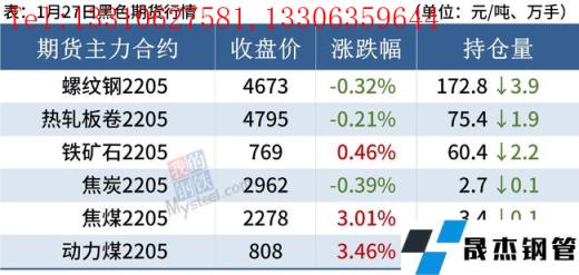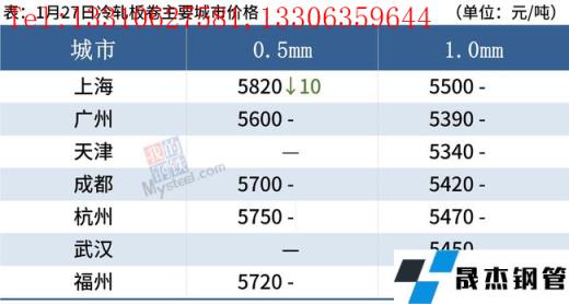 冷軋板卷:1月27日,全國24個主要城市1.0mm冷卷均價5468元/噸,較上個交易日持平。據(jù)不完全統(tǒng)計,現(xiàn)冷軋無縫鋼管廠家庫存36.05萬噸,周環(huán)比增加1.64萬噸,社會庫存125.26萬噸,周環(huán)比增加2.88萬噸,周消費量77.89萬噸,環(huán)比減少1.95萬噸。綜合來看,故預計28日國內(nèi)冷軋板卷價格或?qū)⒗^續(xù)平穩(wěn)運行。