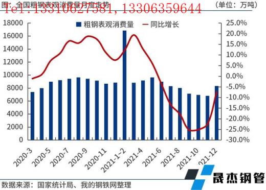 2021年12月份,全國粗鋼日均產量278.04萬噸,環(huán)比大增20.3%,預計1月份產量變化不大。臨近春節(jié)假期,鋼市進入傳統(tǒng)需求淡季。不過,由于多部門集中出臺穩(wěn)增長政策,市場情緒得到提振,加之無縫鋼管廠家集中補庫,原燃料價格強勢上漲,推動鋼價震蕩偏強運行。今年我國基建投資有望發(fā)力,但房地產投資不容樂觀,鋼鐵消費或弱于去年。如果節(jié)后無縫鋼管廠家適度控制產能釋放,合理安排復工復產進度,實現供需動態(tài)平衡,鋼價或延續(xù)震蕩偏強運行。