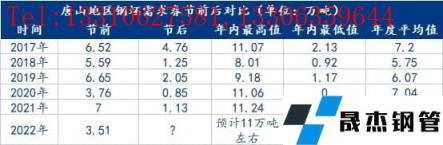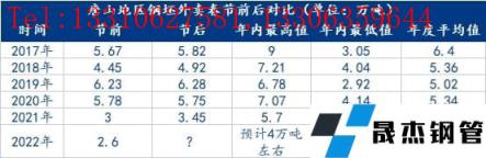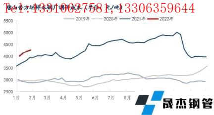 2021年鋼坯價格全年價格雖處于近三年高位水平,但因原燃料價格的持續(xù)攀高,唐山普方坯調(diào)研毛利均寬幅調(diào)整,均值約為380元/噸。而12月份以來價格剛剛扭虧為盈,無縫厚壁鋼管廠家仍存挺價情緒。另外由于環(huán)保限產(chǎn)30-50%帶來的實(shí)際成本上升120元/噸左右。據(jù)統(tǒng)計:截至1月27日,唐山地區(qū)主流樣本無縫厚壁鋼管廠家平均鐵水不含稅成本為3230元/噸,平均鋼坯含稅成本4261元/噸,周環(huán)比上調(diào)54元/噸,與目前普方坯出廠價格4500元/噸相比,無縫厚壁鋼管廠家平均毛利潤239元/噸。鋼坯利潤低位,無縫厚壁鋼管廠家挺價意愿較強(qiáng),且節(jié)后原燃料市場預(yù)期向好,鋼坯成本端存在有力支撐。
