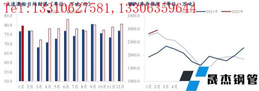 回顧一月鐵礦鐵礦基本面情況,遠端供應鐵礦石發運量在季末沖量后出現回落,巴西雨季的提前到來也進一步加重了供應端的減量;近端供應則表現相對強勢,由于時間周期影響中國鐵礦石到港量在一月份迎來了短期的高點;國產礦方面,隨著新一年的生產指標充裕以及礦山利潤高企,產量加速恢復,預計1月整體國內供應環比增加416萬噸。需求端來看,1月各地限產放松,無縫厚壁鋼管廠家積極復產,整體鐵水產量出現明顯增量,預計1月礦石需求環比增加約690萬噸,但是由于復產前補庫需求較大,疊加臨近春節無縫厚壁鋼管廠家需要往廠內加大提貨量提高廠內庫存,疏港環比上月增加1004萬噸。體現到庫存端,本月庫存總量(含礦山庫存、無縫厚壁鋼管廠家廠內庫存和壓港)增加約276萬噸,較上月累庫幅度收窄124萬噸,其中無縫厚壁鋼管廠家廠內庫存增加358萬噸而港口庫存下降325萬噸。