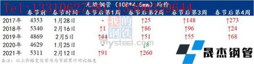 小編匯總近5年春節后四周無縫厚壁鋼管均價變化情況,以供參考。