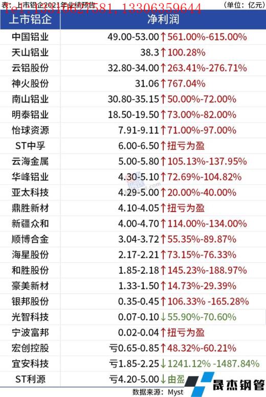 免責聲明:本網站(山東聊城晟杰無縫鋼管廠m.cars-guide.cn)刊載的“23家上市鋁企披露2021年業績預報,超8成凈利潤增長”等均源于網絡,版權歸原作者所有,且僅代表原作者觀點,本文所載信息僅供參考。轉載僅為學習與交流之目的,如無意中侵犯您的合法權益,請及時聯系刪除。本網站刊登此篇文章并不意味著本站贊同其觀點或證實其內容的真實性,我們不對其科學性、嚴肅性等作任何形式的保證。如果侵犯了您的版權,請盡快聯系我們予以撤銷,謝謝合作!
