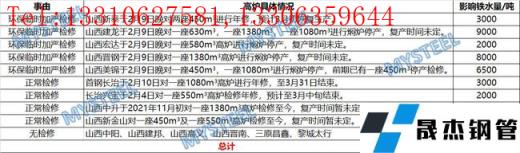 我網(wǎng)前兩日發(fā)布消息“河南、山東及河北唐山地區(qū)部分無縫厚壁鋼管廠家接到臨時限產(chǎn)加嚴(yán)通知。會在原有限產(chǎn)基礎(chǔ)上燒結(jié)全停,個別無縫厚壁鋼管廠家有新增高爐檢修,2月8日下午18點開始執(zhí)行,預(yù)計11日解除。”對此,我網(wǎng)進(jìn)行了進(jìn)一步調(diào)研,山西部分區(qū)域也受之影響進(jìn)行燜爐,具體情況如下: