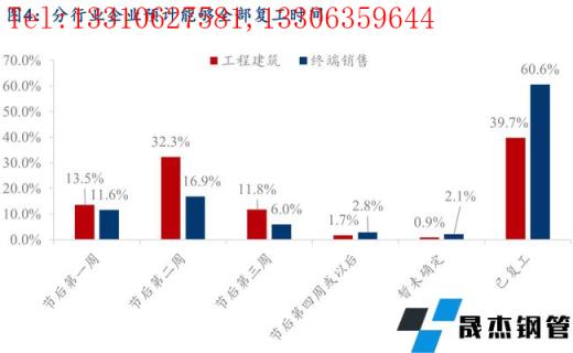 分行業(yè)來看,終端銷售樣本企業(yè)中,60.6%的企業(yè)目前已經(jīng)完全復工,節(jié)后第二周內(nèi)能夠復工的樣本企業(yè)占比可以達到89.1%,主要由于今年節(jié)前冬儲備貨情況整體較少,節(jié)后開門紅的行情走勢下,很多企業(yè)提前復工,積極入市詢價采購,以爭取利潤最大化。工程建筑樣本企業(yè)中,39.7%的企業(yè)目前已經(jīng)完成復工,節(jié)后第二周內(nèi)能夠復工的樣本企業(yè)占比可以達到85.6%,整體進度情況也要好于往年同期水平。僅0.9%的工程建筑企業(yè)和2.1%的終端銷售企業(yè)暫未有明確的復工時間,主要是受疫情以及冬奧會的影響。