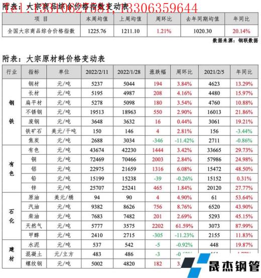 免責聲明:本網站(山東聊城晟杰無縫鋼管廠m.cars-guide.cn)刊載的“MRI:大宗原材料價格周報(2月7日-2月11日)”等均源于網絡,版權歸原作者所有,且僅代表原作者觀點,本文所載信息僅供參考。轉載僅為學習與交流之目的,如無意中侵犯您的合法權益,請及時聯系刪除。本網站刊登此篇文章并不意味著本站贊同其觀點或證實其內容的真實性,我們不對其科學性、嚴肅性等作任何形式的保證。如果侵犯了您的版權,請盡快聯系我們予以撤銷,謝謝合作!