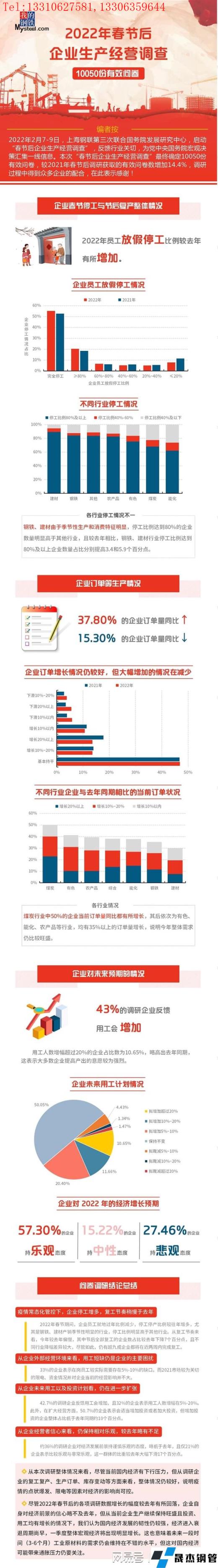 2022年2月7-9日,上海鋼聯(lián)第三次聯(lián)合國務院發(fā)展研究中心,啟動“春節(jié)后企業(yè)生產(chǎn)經(jīng)營調(diào)查”,反饋行業(yè)關(guān)切,為黨中央國務院宏觀決策匯集一線信息。本次“春節(jié)后企業(yè)生產(chǎn)經(jīng)營調(diào)查”最終確定10050份有效問卷,較2021年春節(jié)后調(diào)研獲取的有效問卷數(shù)增加14.4%。 具體結(jié)論如下: