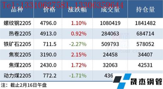 免責聲明:本網站(山東聊城晟杰無縫鋼管廠m.cars-guide.cn)刊載的“2022年02月16日午報:鋼價局部反彈,鋼材_無縫鋼管和焦炭期貨上漲”等均源于網絡,版權歸原作者所有,且僅代表原作者觀點,本文所載信息僅供參考。轉載僅為學習與交流之目的,如無意中侵犯您的合法權益,請及時聯系刪除。本網站刊登此篇文章并不意味著本站贊同其觀點或證實其內容的真實性,我們不對其科學性、嚴肅性等作任何形式的保證。如果侵犯了您的版權,請盡快聯系我們予以撤銷,謝謝合作!