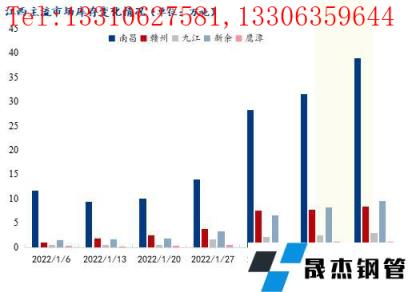 從本周各主流市場庫存走勢來看,各主流市場庫存均繼續(xù)累積。其中南昌市場庫存增幅最大,增幅達到23.20%;九江和新余市場庫存增幅在15%-17%之間;贛州和鷹潭市場庫存增幅在10%以下。目前來看,無縫厚壁鋼管廠家正常發(fā)貨,雖然省內(nèi)多數(shù)商家已經(jīng)開市,但只有少數(shù)工地零星啟動,市場終端需求整體偏弱,成交清淡,以投機鎖貨為主,市場庫存持續(xù)累積。