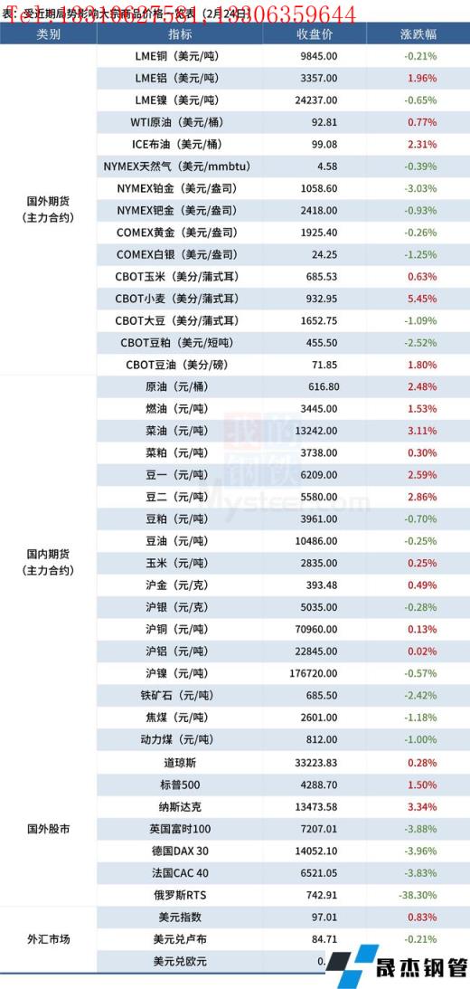 免責聲明:本網站(山東聊城晟杰無縫鋼管廠m.cars-guide.cn)刊載的“受近期局勢影響大宗商品價格一覽表(2月24日)”等均源于網絡,版權歸原作者所有,且僅代表原作者觀點,本文所載信息僅供參考。轉載僅為學習與交流之目的,如無意中侵犯您的合法權益,請及時聯系刪除。本網站刊登此篇文章并不意味著本站贊同其觀點或證實其內容的真實性,我們不對其科學性、嚴肅性等作任何形式的保證。如果侵犯了您的版權,請盡快聯系我們予以撤銷,謝謝合作!