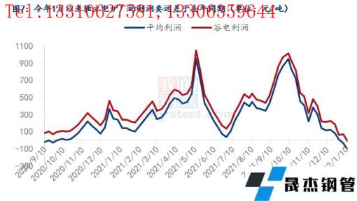 為什么廢鋼資源會存在階段性偏緊?其實在第一部分中已經討論過,廢鋼資源近幾年內都是在每年的1月到節后的一段時間內存在著供需缺口,主要是因為廢鋼加工基地節前會放假,節后復工較晚導致的市場資源偏緊,無縫厚壁鋼管廠家因此在這段時間內收廢較為困難,今年也不例外。但今年1月份61家無縫厚壁鋼管廠家的到貨量同比去年有所降低(圖4所示),到貨量同比有所降低,分析下來大概有三方面原因:一是由于產廢的制造業企業放假較早、房地產行業的走弱,使得社會加工廢鋼減少,外加疫情阻礙了廢鋼資源的流通,導致了廢鋼加工基地收廢困難。今年1月293家樣本基地庫存同比降低有30萬噸左右(圖5所示);二是今年1月以來五大材的總產量低于去年同期(圖6所示);三是電爐廠自今年1月以來普遍處于虧損的狀態,利潤情況要遠差于去年同期(圖7所示)。后面兩方面原因導致了無縫厚壁鋼管廠家降低了廢鋼消耗量,所以今年1月以來61家樣本無縫厚壁鋼管廠家的廢鋼日耗同比低于去年(圖8所示),需求端的走弱聯動了供應端一起走弱。所以以上三方面原因綜合導致了今年1月份來無縫厚壁鋼管廠家收廢量不及去年同期。