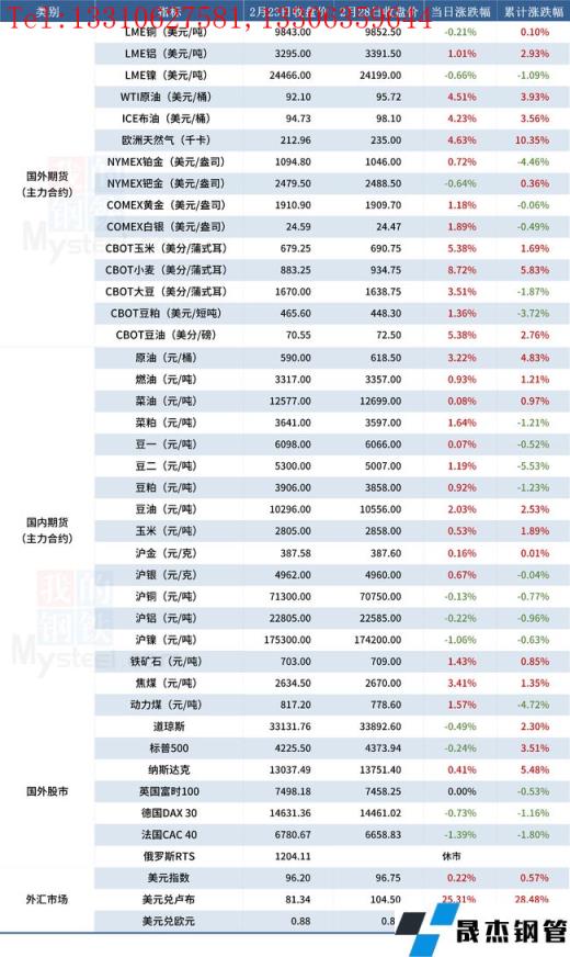 免責聲明:本網站(山東聊城晟杰無縫鋼管廠m.cars-guide.cn)刊載的“受近期局勢影響大宗商品價格一覽表(2月28日)”等均源于網絡,版權歸原作者所有,且僅代表原作者觀點,本文所載信息僅供參考。轉載僅為學習與交流之目的,如無意中侵犯您的合法權益,請及時聯系刪除。本網站刊登此篇文章并不意味著本站贊同其觀點或證實其內容的真實性,我們不對其科學性、嚴肅性等作任何形式的保證。如果侵犯了您的版權,請盡快聯系我們予以撤銷,謝謝合作!