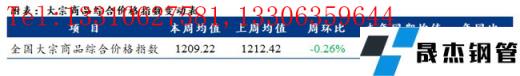 全國大宗商品綜合價格指數均值為1209.22,環比下降,降幅0.26%(前值4.39%);同比上升,增幅15.19%(前值17.06%)。