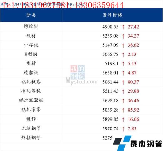3月1日普鋼絕對價格指數變化:綜合指數5157.2,上漲42.54;螺紋鋼指數4900.55,上漲27.42;線材指數5239.08,上漲34.27;熱軋板卷指數5061.44,上漲80.37;冷軋板卷指數5511.43,上漲29.88;中厚板指數5147.09,上漲38.62。
