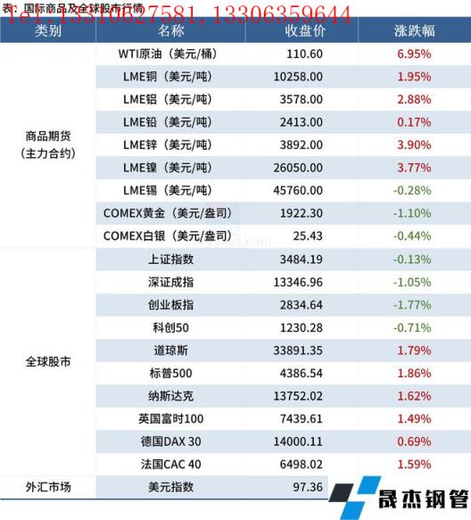 ◎ 安賽樂米塔爾歐洲公司宣布從2022年3月1日起將當地銷售的熱軋板卷價格大幅提高180歐元/噸(200美元/噸)。歐洲無縫厚壁鋼管廠家可能將冷軋板卷的目標價格定在1250歐元/噸(1389美元/噸),熱鍍鋅板定在1300歐元/噸(1445美元/噸)。