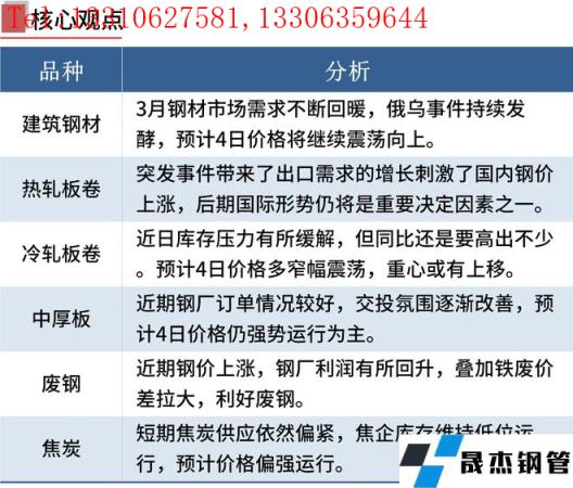 建筑厚壁無縫鋼管:3月3日,全國31個主要城市20mm三級抗震螺紋鋼均價4949元/噸,較上個交易日上漲25元/噸。供應方面,隨冬奧會結束,3月產量回升是確定性事件,在后期殘奧會及兩會結束后,產量后續的回升速度加快;成交來看,進入金3月,近期市場情緒好轉,且下游終端陸續復工,現貨價格跟隨期貨價格反彈后,成交也逐漸進入正軌。短期來看,在3月市場需求不斷回暖的情況下,還需繼續驗證在3月后期需求能否大規模的復蘇,若需求恢復力度尚可,疊加國內宏觀利好持續推進,國際俄烏事件持續發酵,從而支撐國內外厚壁無縫鋼管價格,因此預計4日國內建筑厚壁無縫鋼管或將繼續震蕩向上。