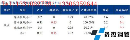1、調(diào)研數(shù)據(jù)顯示,統(tǒng)計(jì)的河南地區(qū)10家建筑厚壁無(wú)縫鋼管樣本無(wú)縫厚壁鋼管廠家中,河南省無(wú)縫厚壁鋼管廠家線盤日均產(chǎn)量0.81萬(wàn)噸,較上周小幅增加0.15萬(wàn)噸;檢修/限產(chǎn)影響建材日產(chǎn)量為0.32萬(wàn)噸,產(chǎn)能利用率71.68%,較上周上升13.27%。