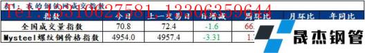 訊:全國(guó)建筑厚壁無(wú)縫鋼管成交量監(jiān)測(cè),成交量相對(duì)指數(shù)來(lái)看,全國(guó)70.8減1.6,北方34.5減3.4,華東104.9減4.5,南方56.7增2.2。今日螺紋鋼價(jià)格指數(shù)4954,較上一交易日減3.31。