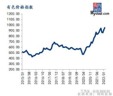 2月份有色價格指數(shù)為949.46,環(huán)比上漲4.23%,同比上漲33.23%。