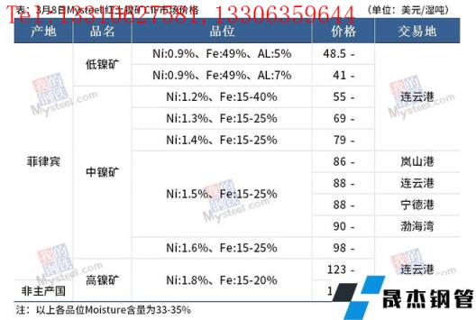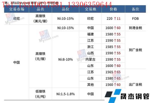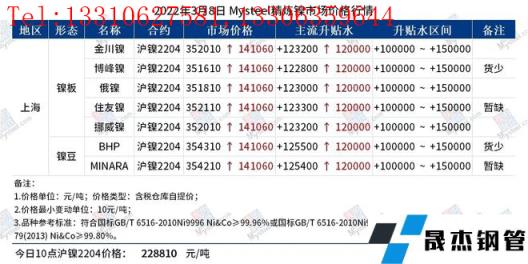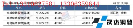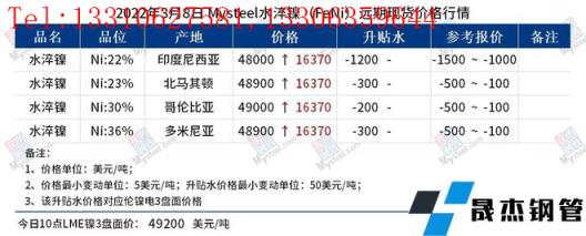 免責聲明:本網站(山東聊城晟杰無縫鋼管廠m.cars-guide.cn)刊載的“鎳產業鏈價格(2022.3.8)”等均源于網絡,版權歸原作者所有,且僅代表原作者觀點,本文所載信息僅供參考。轉載僅為學習與交流之目的,如無意中侵犯您的合法權益,請及時聯系刪除。本網站刊登此篇文章并不意味著本站贊同其觀點或證實其內容的真實性,我們不對其科學性、嚴肅性等作任何形式的保證。如果侵犯了您的版權,請盡快聯系我們予以撤銷,謝謝合作!