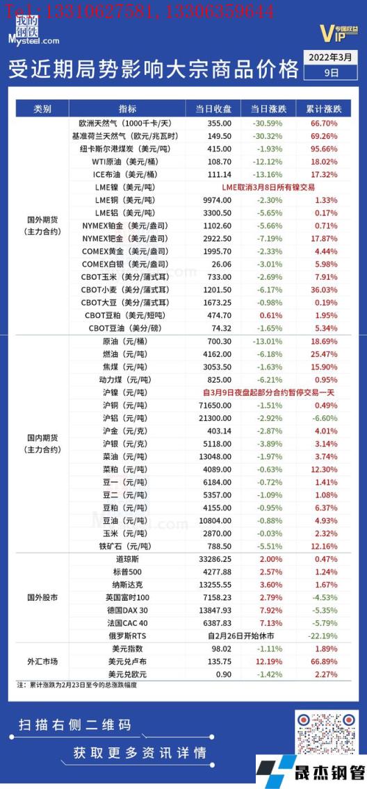 近期,受國(guó)際局勢(shì)影響,全球金融及大宗商品市場(chǎng)出現(xiàn)較大波動(dòng)。3月9日,伴隨俄烏局勢(shì)出現(xiàn)緩和跡象,能源和有色金屬上演了行情“大反轉(zhuǎn)”,歐美股市則大幅上漲。匯總情況如下: