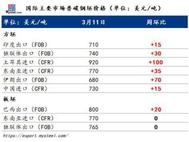 本周東南亞資源報價持續上漲。本周越南報價達到800美元/噸FOB,較上周大幅上漲85美元/噸。據了解,越南目前出口訂單充足,4月貨物已經全部被訂購,目前報價貨物為5月發出。目前越南方坯主要買家為菲律賓,本周早些時候,菲律賓以780美元/噸FOB價格采購越南高爐方坯,隨后越南報價上漲。