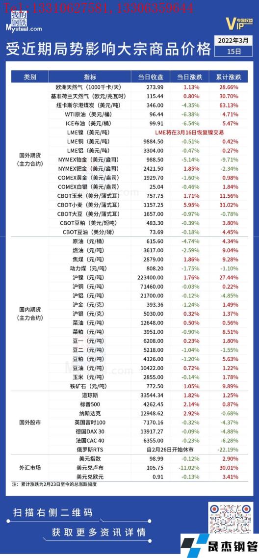 近期,受國際局勢影響,全球金融及大宗商品市場出現(xiàn)較大波動(dòng)。3月15日,國際能源價(jià)格繼續(xù)大跌,WTI原油與布油均降至100美元以下。匯總情況如下: