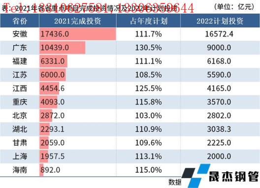 據不完全統(tǒng)計,截至3月16日,已有11個省份公布其2021年重點項目完成投資情況。根據地方政府公開資料顯示,11個省份2021年重點項目共完成投資近5.9萬億元,且均超過當年計劃目標。2022年,上述11省份共計劃投資近5.6萬億元,其中安徽省計劃投資超1.65萬億,排名第一。