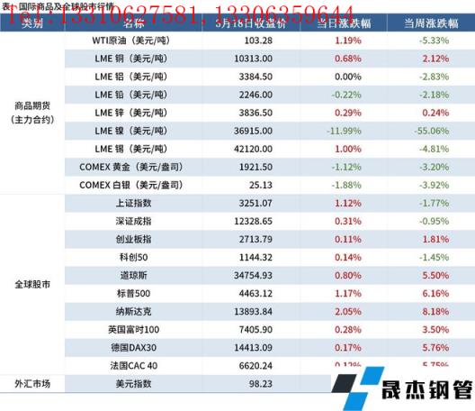 當(dāng)周,商品期貨方面,原油、鋁、黃金價(jià)格明顯下跌,倫鎳開盤后連續(xù)3日跌停,周度大跌55.06%;商品方面僅銅、鋅價(jià)格小幅上漲。全球股市方面,中國(guó)股市下跌,歐美股市上漲,其中,納斯達(dá)克指數(shù)漲幅逾8%。外匯市場(chǎng)方面,美元指數(shù)收于98.23,下跌0.91%。