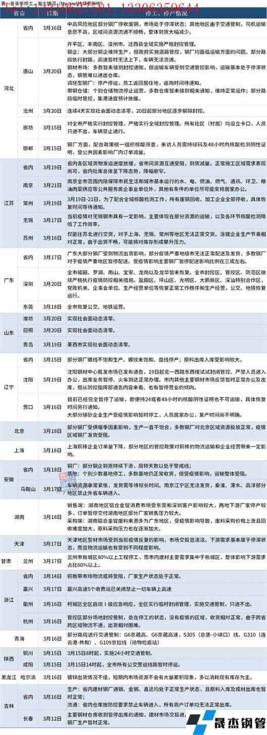 截至3月21日,匯總了16個省份停工停產最新信息。其中,3月21日,南京全市范圍內除保障市民生活和城市基本運行的水、電、燃油、燃氣、通訊、環(huán)衛(wèi)、糧油肉菜供應等公共服務類企事業(yè)單位外,其他有條件的單位盡可能安排居家辦公。3 月20日,唐山開平區(qū)、豐南區(qū)、灤州市、遷西縣全域實施嚴格封控管理;大部分鋼企維持生產,但政府實施道路管控,無縫厚壁鋼管廠家均面臨運輸方面的問題。深圳全市福田、羅湖、南山、寶安、龍崗以及龍華暫未恢復,全市封控區(qū)、管控區(qū)、防范區(qū)繼續(xù)嚴格執(zhí)行疫情防控相關措施。山東濰坊日照、青島萊西市實現社會面動態(tài)清零。河北滄州連續(xù)4天實現社會面動態(tài)清零,3月20日起部分地區(qū)逐步解除封控。具體情況如下: