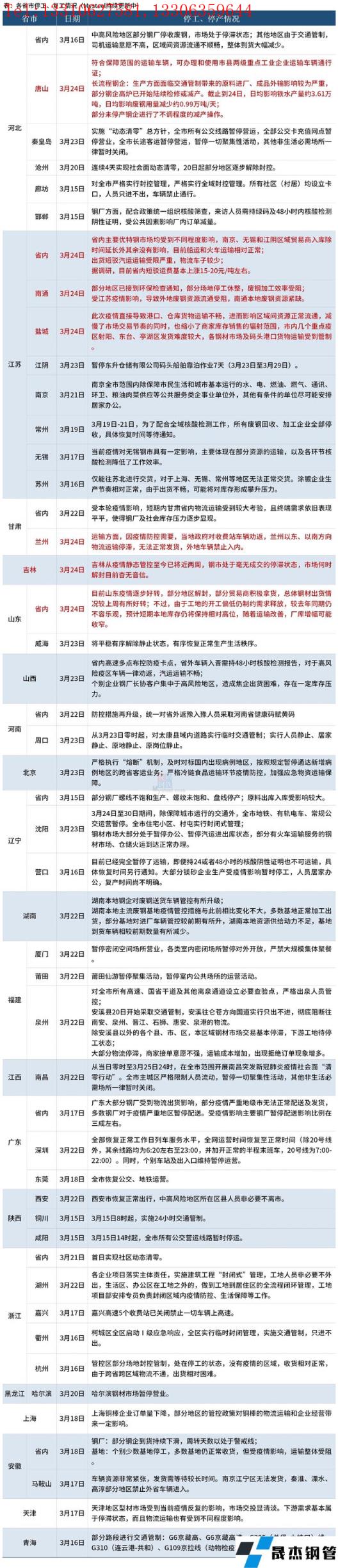 截至3月25日,匯總了20個(gè)省份停工復(fù)工最新信息。其中,河北唐山市符合保障范圍的運(yùn)輸車輛,可辦理和使用市縣兩級重點(diǎn)工業(yè)企業(yè)運(yùn)輸車輛通行證。江蘇南通部分地區(qū)已接到環(huán)保檢查通知,部分場地停工休整,廢鋼加工效率受阻。吉林從疫情靜態(tài)管控至3月24日將近兩周,鋼市處于毫無成交的停滯狀態(tài),市場何時(shí)解封目前杳無音信。具體情況如下: