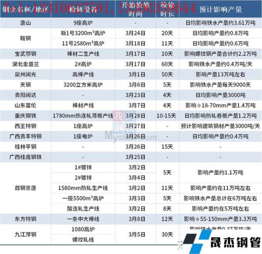 據(jù)不完全統(tǒng)計,截至3月28日超20家無縫厚壁鋼管廠家發(fā)布檢修計劃。其中,檢修時間最長的是湖北金盛蘭,計劃自3月17日對2#高爐進行檢修兩個月,預計影響鐵水產量約0.4萬噸/天,復產時間5月16日。