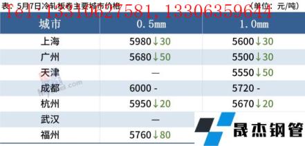 冷軋板卷:5月7日,全國24個主要城市1.0mm冷卷均價5651元/噸,較上個交易日下跌24元/噸。期貨大幅下跌,市場交投氛圍驟然冷清,價格步入下行通道。下游“買漲不買跌”心態明顯,拿貨積極性明顯下降。預計下周國內冷軋板卷價格或將繼續偏弱運行。