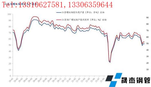 圖二:江蘇省螺紋鋼產量及開工走勢圖