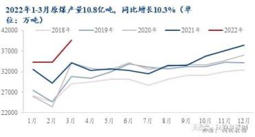回顧2022年一季度我國煤炭及電力供需形勢發現,國內能源生產保障能力大幅增強:一季度全國原煤產量累計生產10.8億噸,同比增長10.3%。