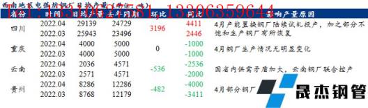 3、云南地區(qū)4月電弧爐無縫厚壁鋼管廠家日均建筑厚壁無縫鋼管產(chǎn)量為2036噸,環(huán)比減少536噸,降幅20.83%;同比減少2536噸,降幅55.47%。受省內(nèi)供需矛盾持續(xù)加大,云南無縫厚壁鋼管廠家聯(lián)合控產(chǎn),其中電弧爐無縫厚壁鋼管廠家不飽和生產(chǎn),產(chǎn)量環(huán)比小幅下降。
