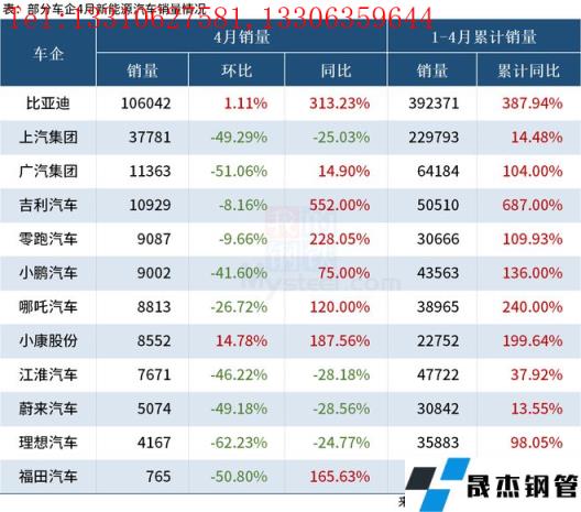 從同比來看,12家車企中有7成以上車企4月新能源汽車銷量均實現(xiàn)增長,其中吉利汽車銷量增幅最大,高達(dá)552%;其次為比亞迪汽車,銷量大增313.23%;零跑汽車銷量增長228.05%。
