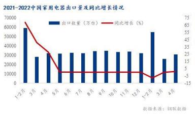 從統計局公布的最新數據看,2022年一季度中國家用電器出口數量為81097萬臺,相比2021年同期減少了7001萬臺,同比下降7.9%。其中4月中國家用電器出口量31164.8萬臺,同比增長1.0%。
