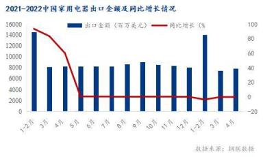 從統計局公布的最新數據看,2022年一季度中國家用電器累計出口金額29387百萬美元,同比下降5.3%。其中4月中國家用電器出口金額7860.0百萬美元,同比下降0.1%。