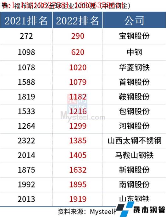 5月12日,福布斯2022全球企業2000強發布。據統計,中國鋼鐵行業共有12家企業上榜。分別是寶鋼股份、中鋼、華菱鋼鐵、首鋼股份、鞍鋼股份、包鋼股份、河鋼股份、山西太鋼不銹鋼、馬鞍山鋼鐵、新鋼股份、南鋼股份和山東鋼鐵。具體排名如下: