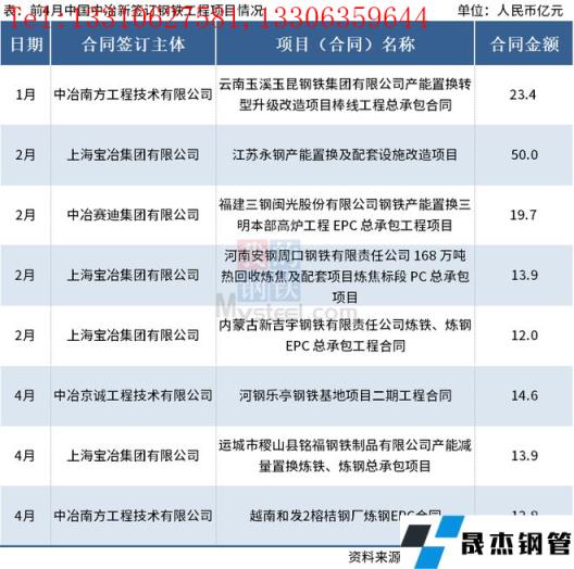據中國中冶消息,2022年1-4月新簽合同額人民幣4057.3億元,較上年同期增長12.2%。其中10億元以上的重大鋼鐵工程承包合同8個,合同金額160.3億元,具體項目明細如下: