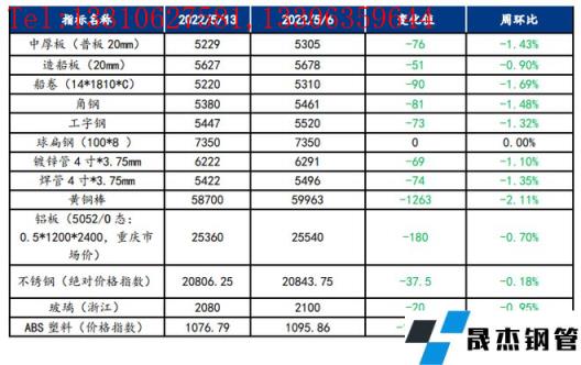 截止2022年5月13日,各原材料當日即時價格以及價格周環(huán)比情況如下: