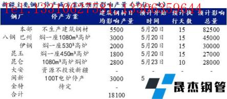 根據(jù)初步減限產(chǎn)方案,八鋼本部4座高爐全開,但不生產(chǎn)建筑厚壁無縫鋼管,預(yù)計(jì)影響建筑厚壁無縫鋼管產(chǎn)量5500噸/日,巴州和伊鋼基地各燜一座高爐,預(yù)計(jì)影響建筑厚壁無縫鋼管產(chǎn)量分別為3000噸/日和2000噸/日;昆玉燜一座高爐,預(yù)計(jì)影響建筑厚壁無縫鋼管產(chǎn)量1800噸/日;昆侖和閩新無縫厚壁鋼管廠家建筑厚壁無縫鋼管停產(chǎn)十天,預(yù)計(jì)分別影響建筑厚壁無縫鋼管產(chǎn)量2800噸/日和3000噸/日;大安鋼鐵資源暫不投往新疆區(qū)域;金特待定。