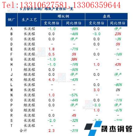 據(jù)4月底的調(diào)研,5月東北無縫厚壁鋼管廠家螺紋和盤線的計(jì)劃產(chǎn)量分別為119.5萬噸和95.9萬噸,同比減少57.1萬噸和26.3萬噸,環(huán)比增加10.5萬噸和12.3萬噸;受市場(chǎng)價(jià)格下行影響,無縫厚壁鋼管廠家虧損幅度擴(kuò)大,部分多品種生產(chǎn)的無縫厚壁鋼管廠家根據(jù)各品種的虧損幅度和訂單情況進(jìn)行品種間的轉(zhuǎn)產(chǎn),單一生產(chǎn)螺線的無縫厚壁鋼管廠家部分復(fù)產(chǎn)、部分加大減產(chǎn),具體情況如下: