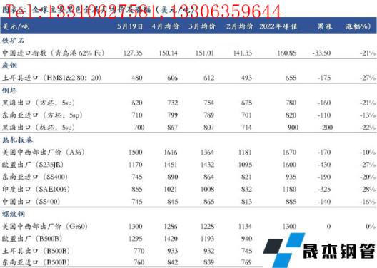 截至5月19日,中國(guó)鐵礦石進(jìn)口從4月初峰值累計(jì)下跌21%,土耳其廢鋼累計(jì)跌幅達(dá)到27%。從各品種區(qū)域價(jià)格走勢(shì)來(lái)看,熱卷綜合跌幅達(dá)到20%,而螺紋鋼跌幅在8%左右,歐洲熱卷價(jià)格累計(jì)跌幅為27%,相比之下美國(guó)跌幅最小,約10%。(圖表5)